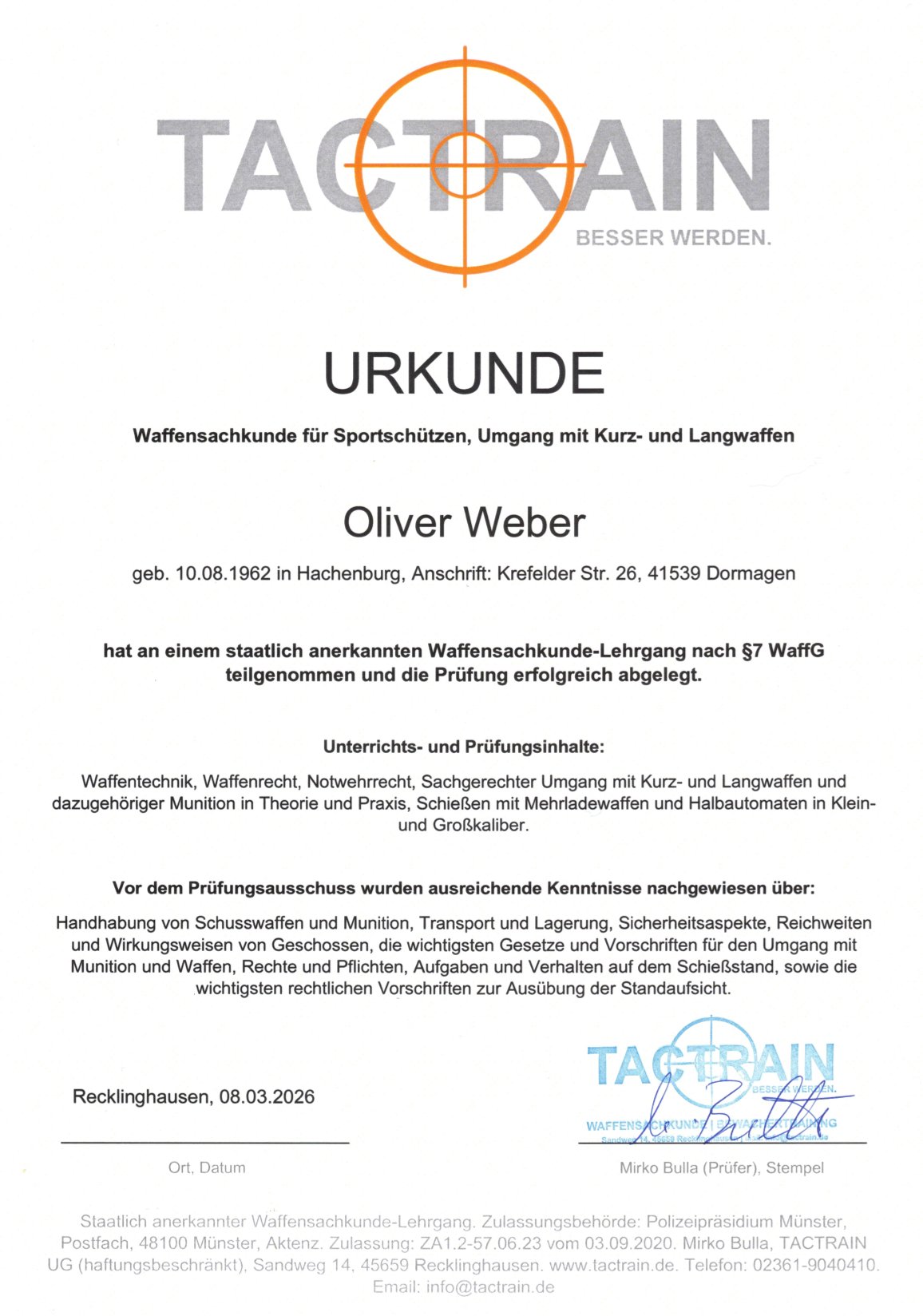 Ergänzend verfüge ich über die Waffensachkunde gemäß §7 des deutschen Waffengesetzes (WaffG) für Kurz- und Langwaffen mit fundierten Kenntnissen zu rechtlichen Rahmenbedingungen sowie dem sicheren und verantwortungsvollen Umgang mit Schusswaffen.