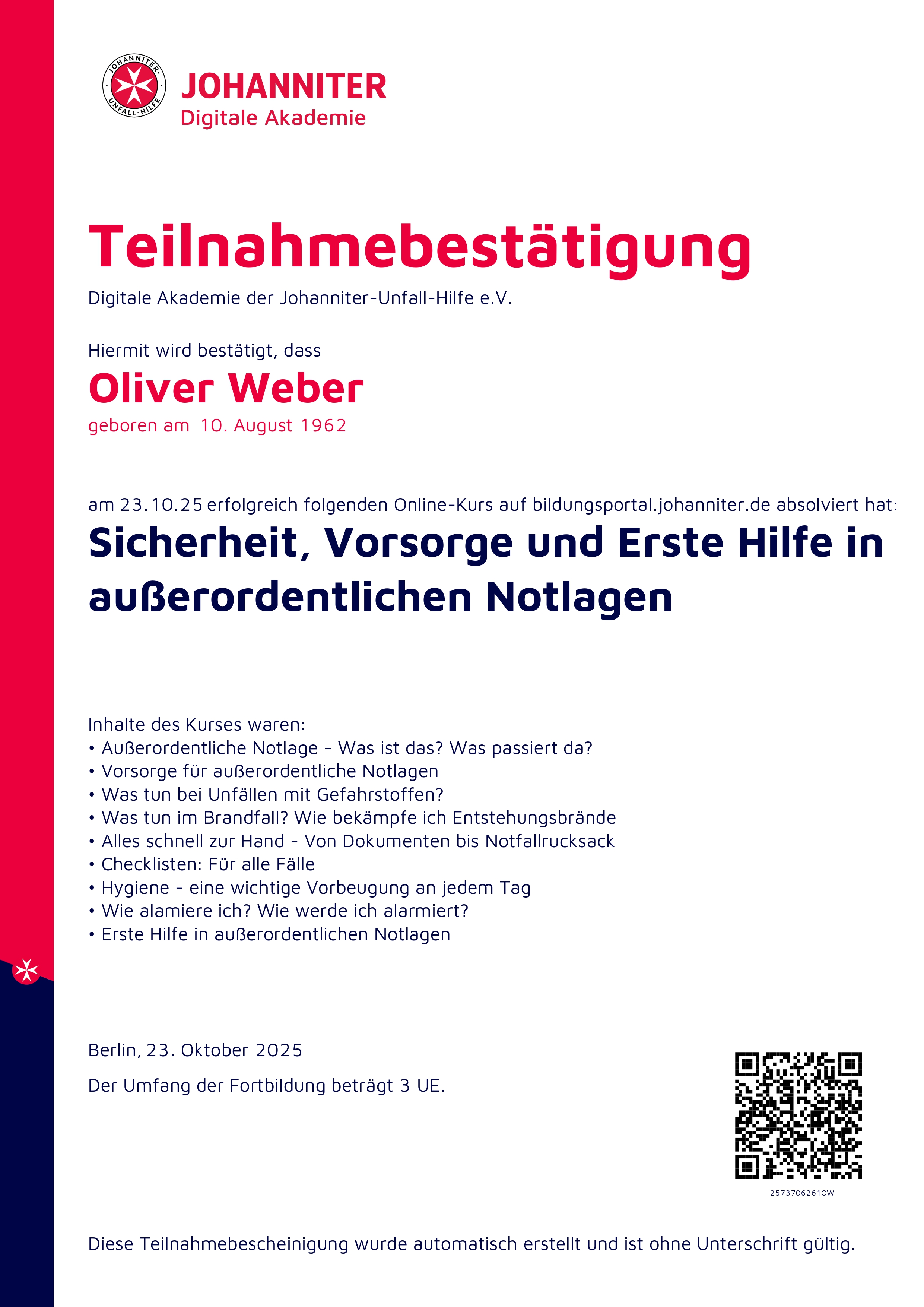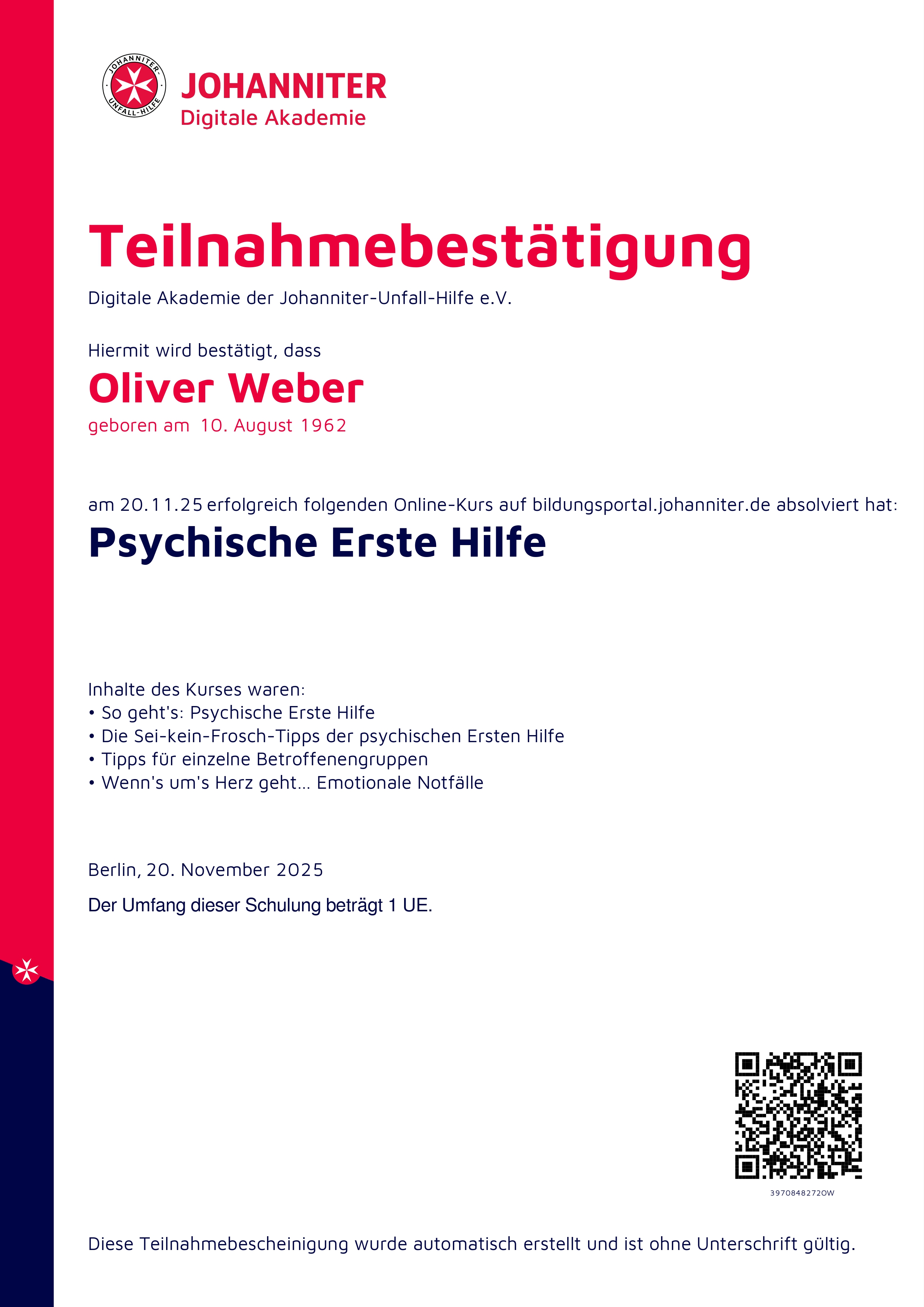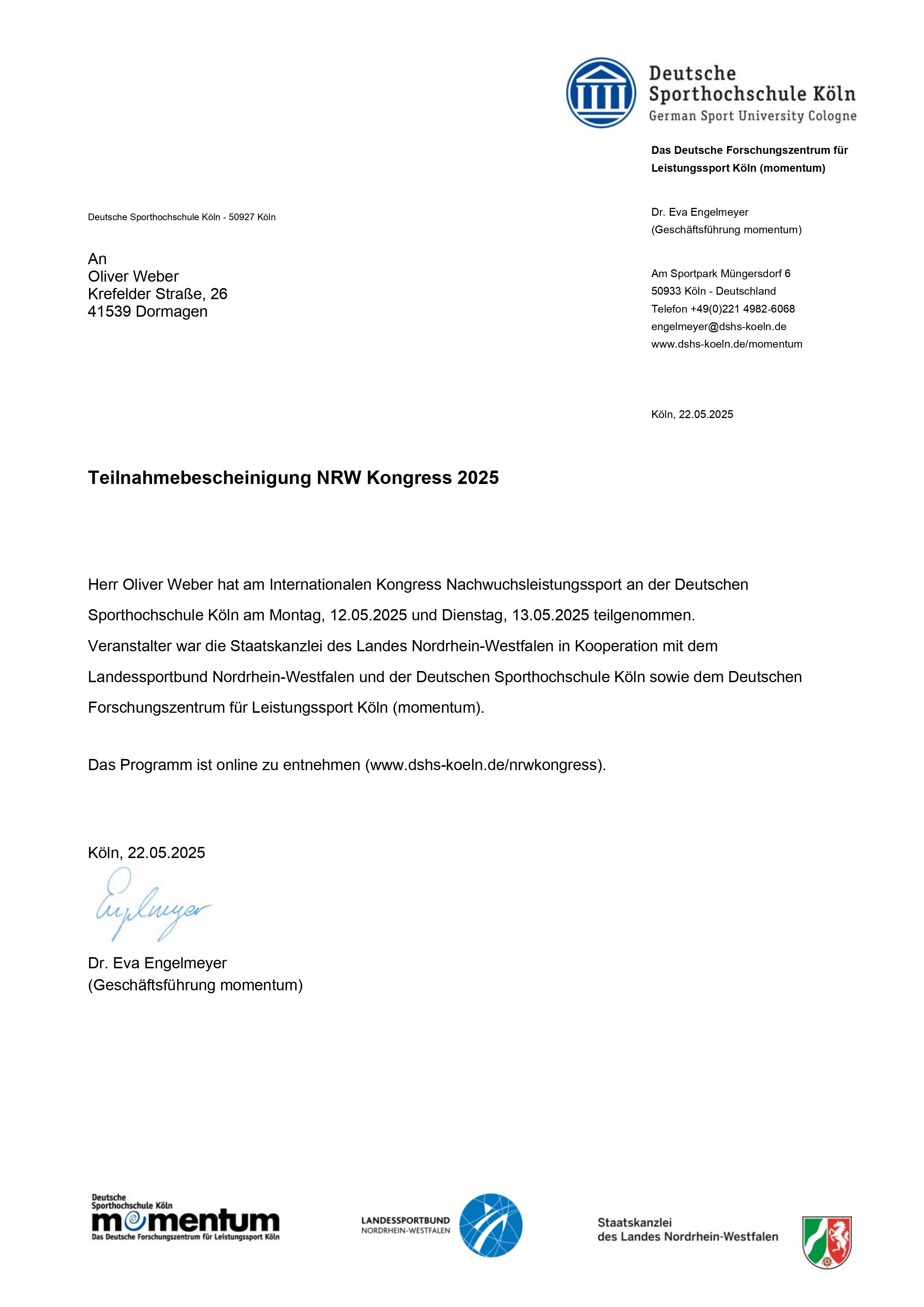 Hier finden Sie eine Auswahl meiner fachlichen Qualifikationsnachweise sowie Teilnahmebescheinigungen an relevanten Kongressen, Seminaren und Sportveranstaltungen.